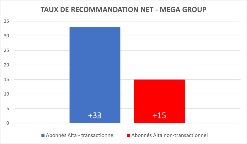 *: * : Le Taux de Recommandation Net est un indice obtenu en soustrayant le % de promoteurs (une note de 9 ou 10) moins le % de détracteurs (une note de 0 à 6) sur une probabilité de « recommander Mega Group à d’autres détaillants”.